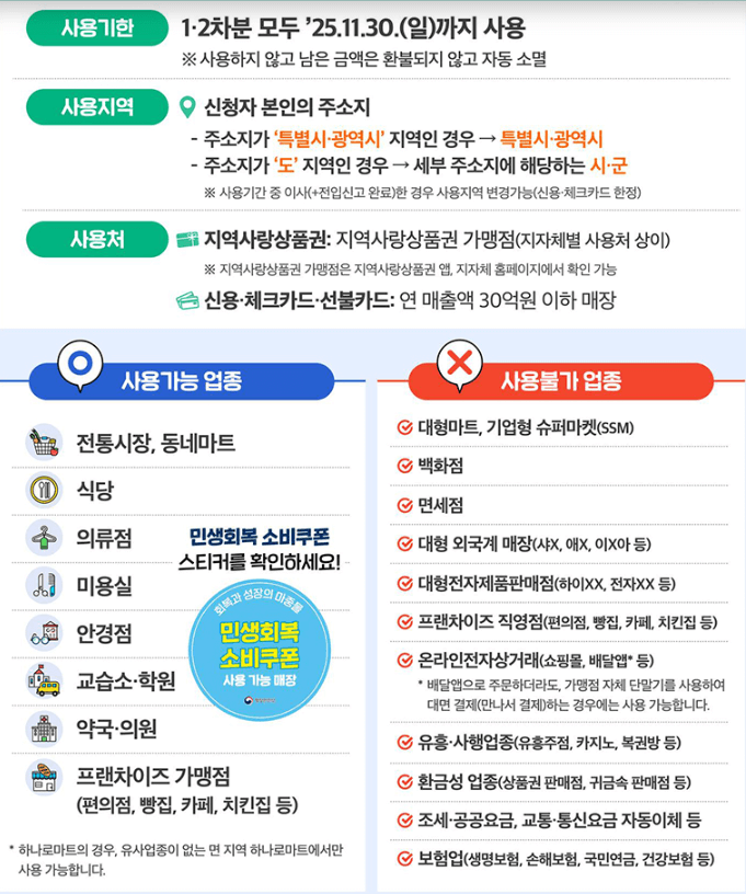 사용 가능 장소: 전통시장, 식당, 미용실, 안경점, 편의점 등 (연매출 30억 이하 소상공인 매장)