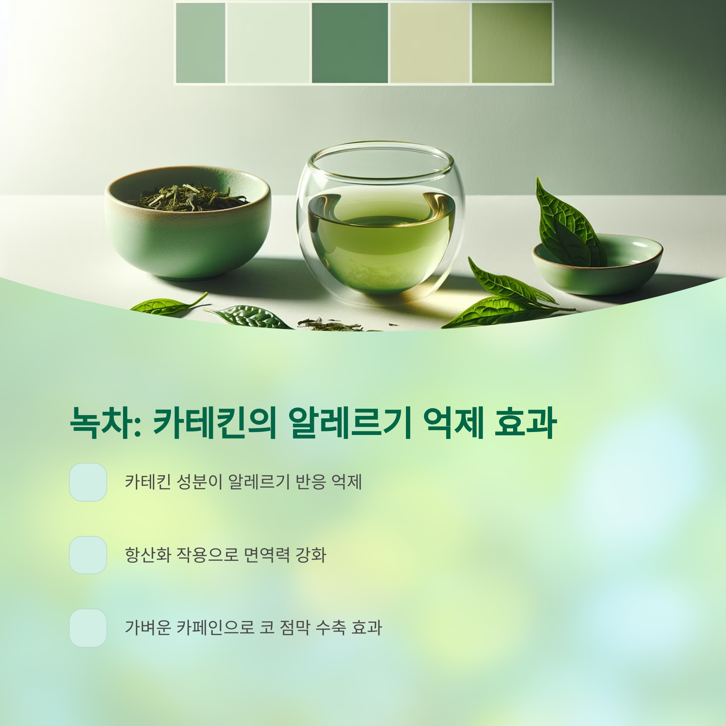 녹차는 항산화, 항균, 항바이러스 작용이 강한 카테킨 성분을 함유하고 있어 알레르기성 비염으로 인한 과민 반응을 완화하는 데 도움을 줍니다. 또한 비타민C와 아미노산이 풍부해 면역력 강화에도 좋습니다.