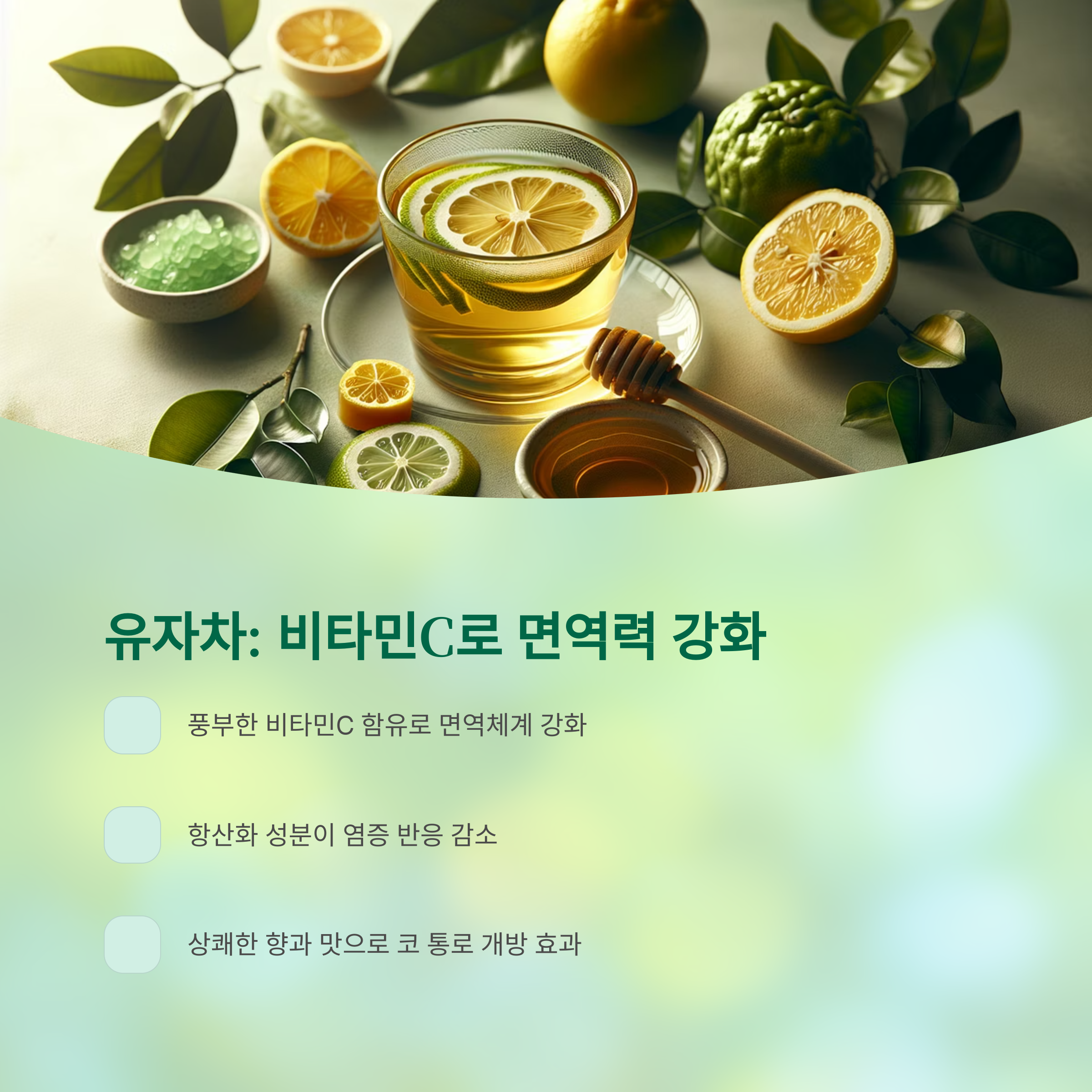 유자차는 비타민C가 풍부해 면역력을 높이고, 비강 점막을 보호하는 데 도움을 줍니다. 또한 유자 껍질의 헤스페리딘 성분은 혈관을 강화하고 항히스타민 작용으로 알레르기 반응을 완화해 비염 증상 완화에 효과적입니다.