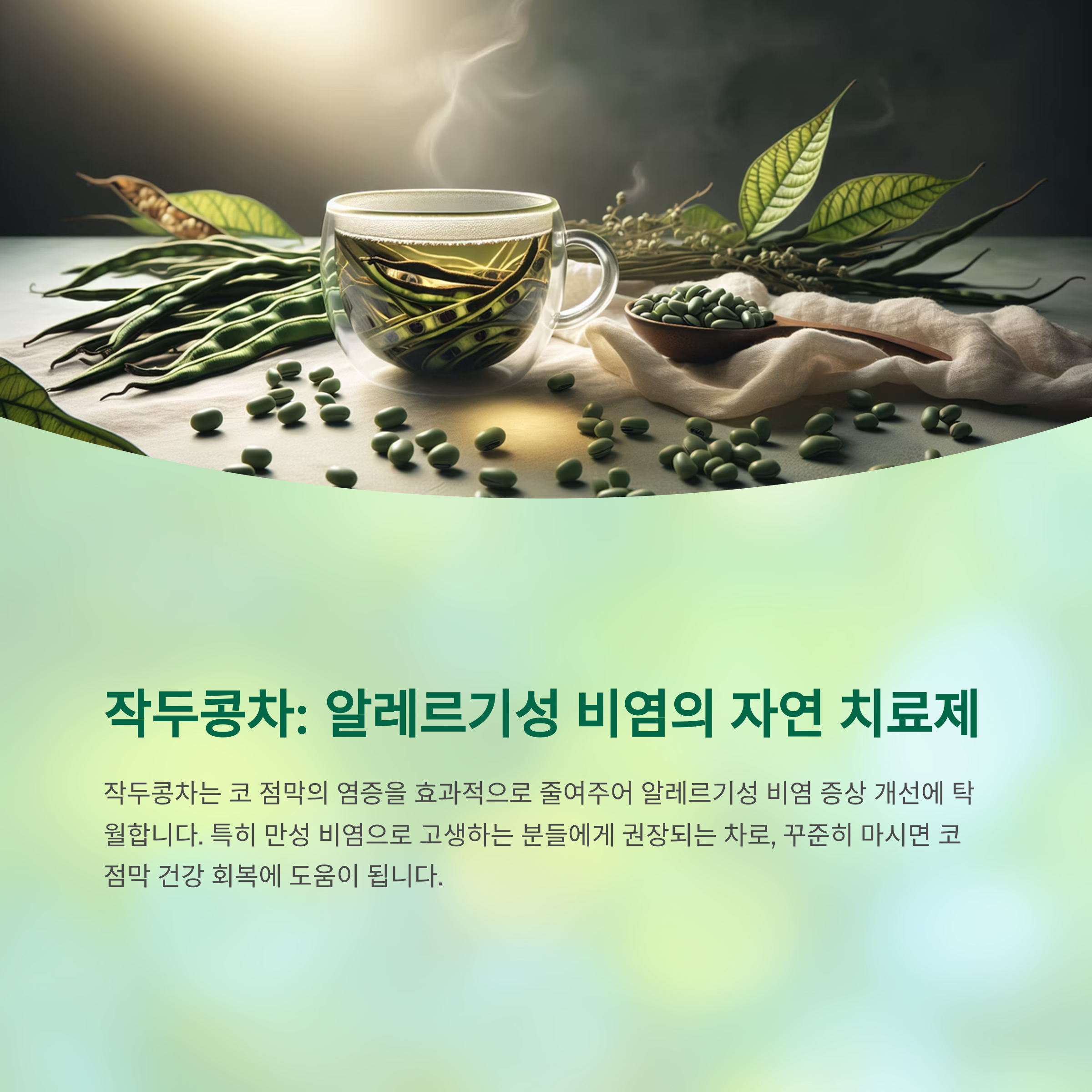 작두콩차는 축농증, 만성 비염, 알레르기성 비염에 좋은 차로 유명합니다. 작두콩에는 사포닌, 식이섬유, 우레아제 등의 성분이 함유되어 있어 점막의 염증을 줄이고 면역력을 높여줍니다.