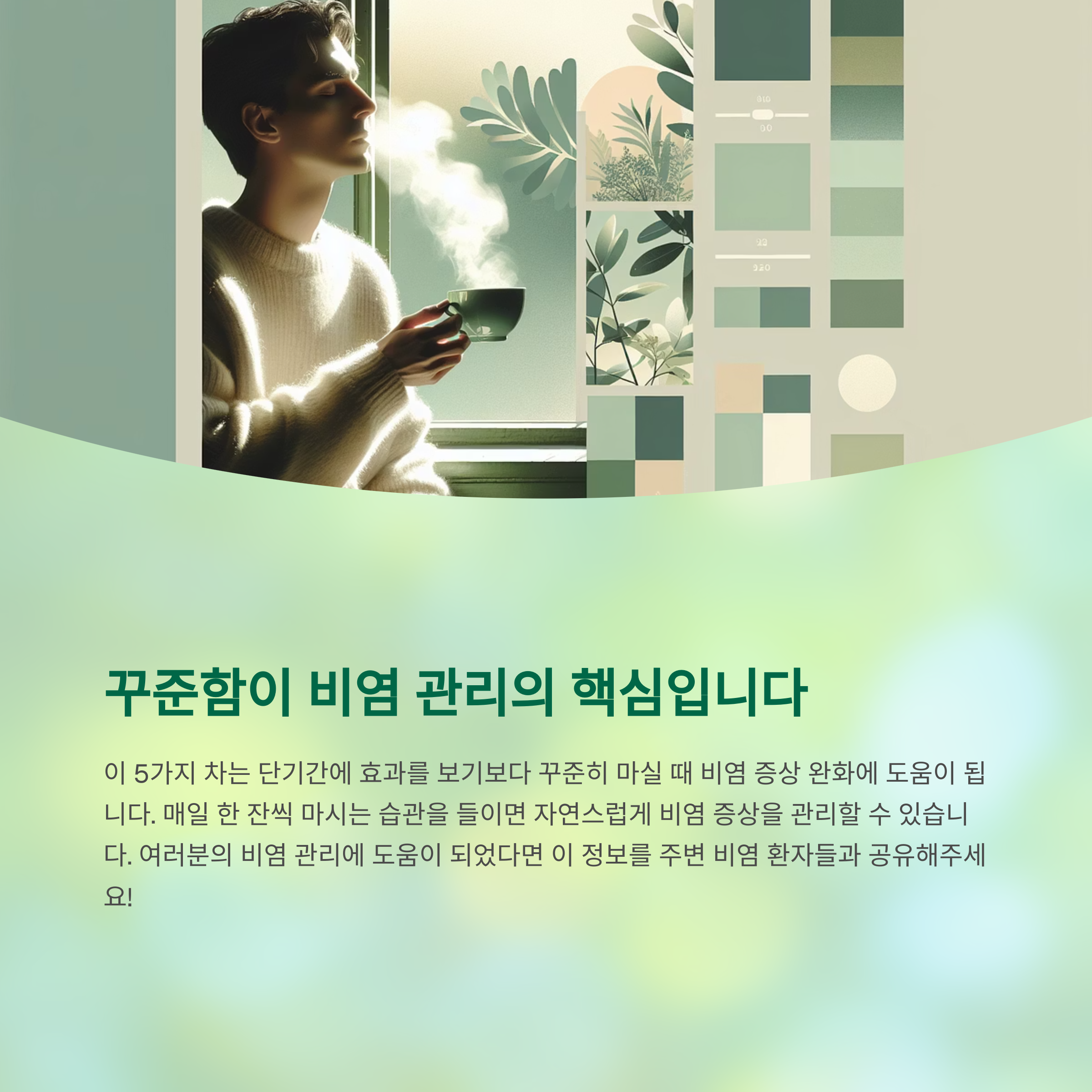 오늘은 비염에 좋은 차 5가지를 알아보았습니다. 생강차, 작두콩차, 유자차, 도라지차, 녹차 모두 비염 증상을 완화하고 면역력을 높이는 데 도움이 되는 자연요법입니다. 각 차의 효능과 주의사항을 기억해 생활 속에서 꾸준히 실천해 보세요. 따뜻한 차 한 잔으로 시작하는 하루가 여러분의 비염 극복과 건강 유지에 큰 힘이 될 것입니다.