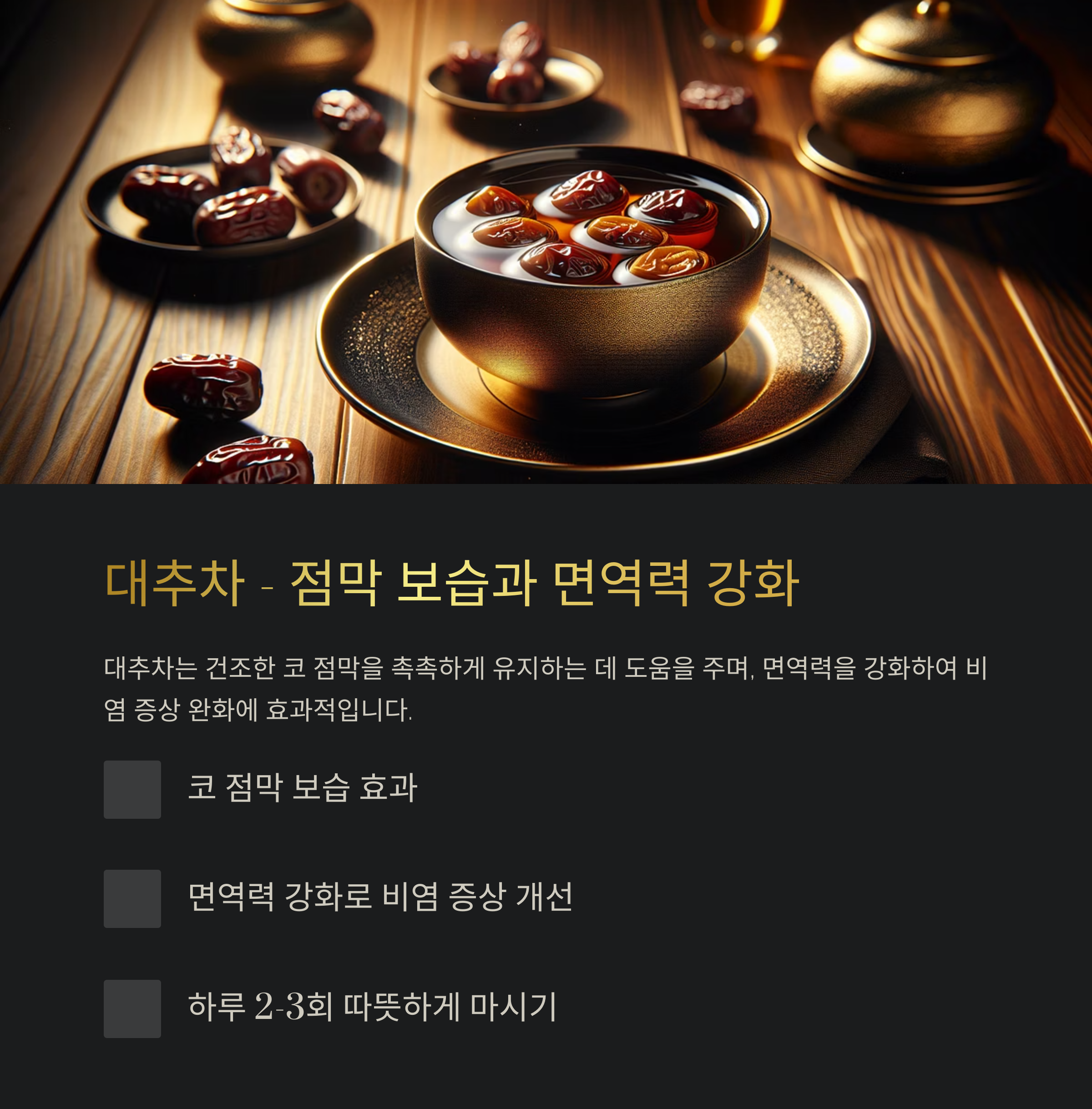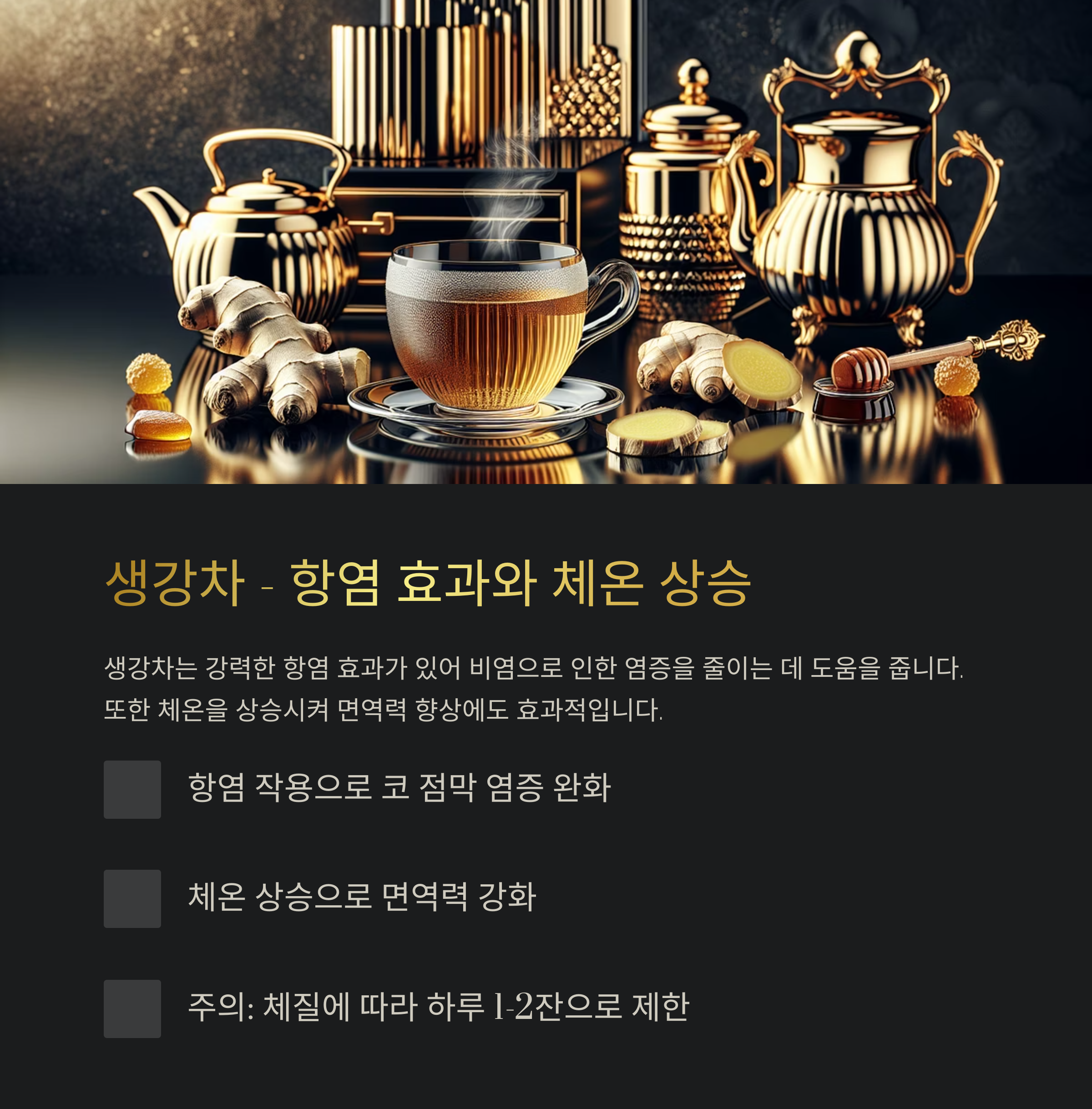첫째, 생강차는 몸을 따뜻하게 해 주고 강력한 항염 작용으로 점막 혈류를 개선해 코막힘을 완화합니다. 생강의 진저롤과 쇼가올 성분은 염증 억제와 면역력 강화에 효과적이며, 체온을 높여 차가운 환경에서도 점막이 민감해지지 않도록 도와줍니다. 둘째, 대추차는 비타민, 미네랄, 사포닌이 풍부해 면역력을 높이고 점막을 촉촉하게 유지해 콧물과 재채기 증상을 줄여줍니다. 셋째, 도라지차는 사포닌 성분이 풍부해 기관지 점액 분비를 촉진하고 가래 배출, 기침 완화, 목 건강 유지에 효과적입니다. 넷째, 계피차는 혈액순환을 개선하고 몸을 데워주며, 알레르기성 비염으로 인한 냉증과 코막힘 완화에 좋습니다. 다섯째, 국화차는 항염, 해열, 해독 작용이 있어 비염으로 인한 두통, 눈 가려움 완화에 도움이 됩니다. 여섯째, 녹차는 카테킨 성분이 강력한 항산화·항염 작용을 하지만 카페인이 있어 오후 늦게는 피하는 것이 좋습니다.