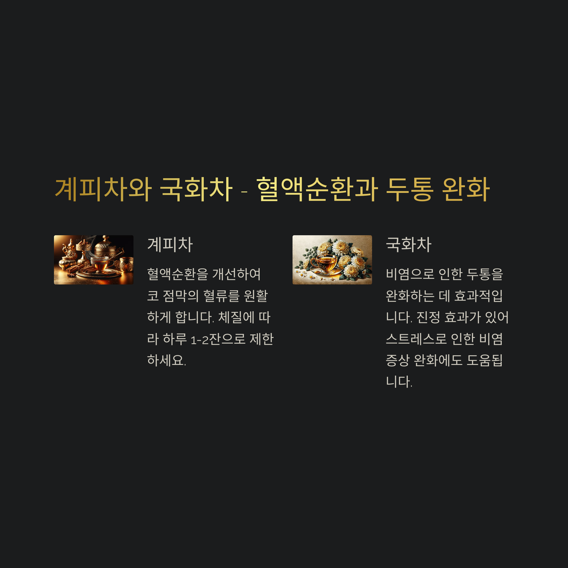 차는 너무 뜨겁지 않게 따뜻한 온도로 마시는 것이 좋습니다. 과도하게 뜨거운 차는 점막을 자극할 수 있고, 찬 차는 점막을 수축시켜 코막힘을 악화시킵니다. 또한 꿀이나 설탕을 과하게 넣으면 혈당 상승과 염증 반응을 촉진하므로, 꿀을 소량만 넣거나 무가당으로 마시는 것을 권장합니다. 차를 마신 후에는 코 주변을 따뜻한 수건으로 찜질하거나, 유칼립투스·티트리 오일을 이용해 코 주변과 흉곽을 마사지해 보세요. 이러한 아로마 세러피는 점막 기능 회복과 호흡기 건강에 도움을 줍니다.