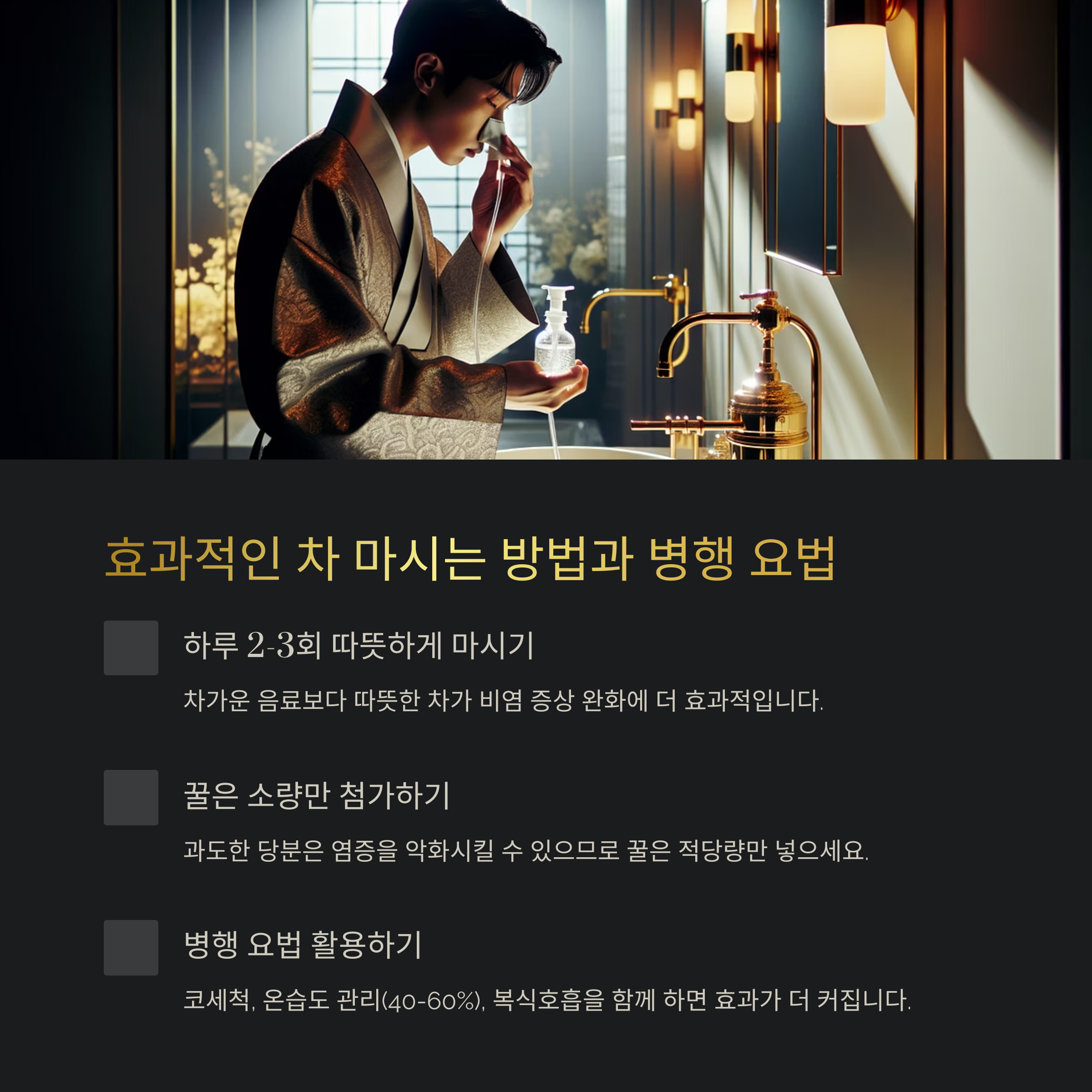 비염 증상 완화를 위해서는 차 섭취뿐 아니라 식염수 코세척, 실내 온습도 유지(20~22도, 습도 50~60%), 규칙적인 유산소 운동, 복식호흡, 충분한 수면까지 병행해야 합니다. 예를 들어 아침 기상 후 코세척, 낮 시간 10분간 복식호흡, 저녁에는 반신욕과 차 한 잔으로 마무리하는 루틴을 만들어보세요. 이러한 작은 실천들이 모여 비염 증상을 크게 완화하고 약물 의존도를 줄여줍니다.