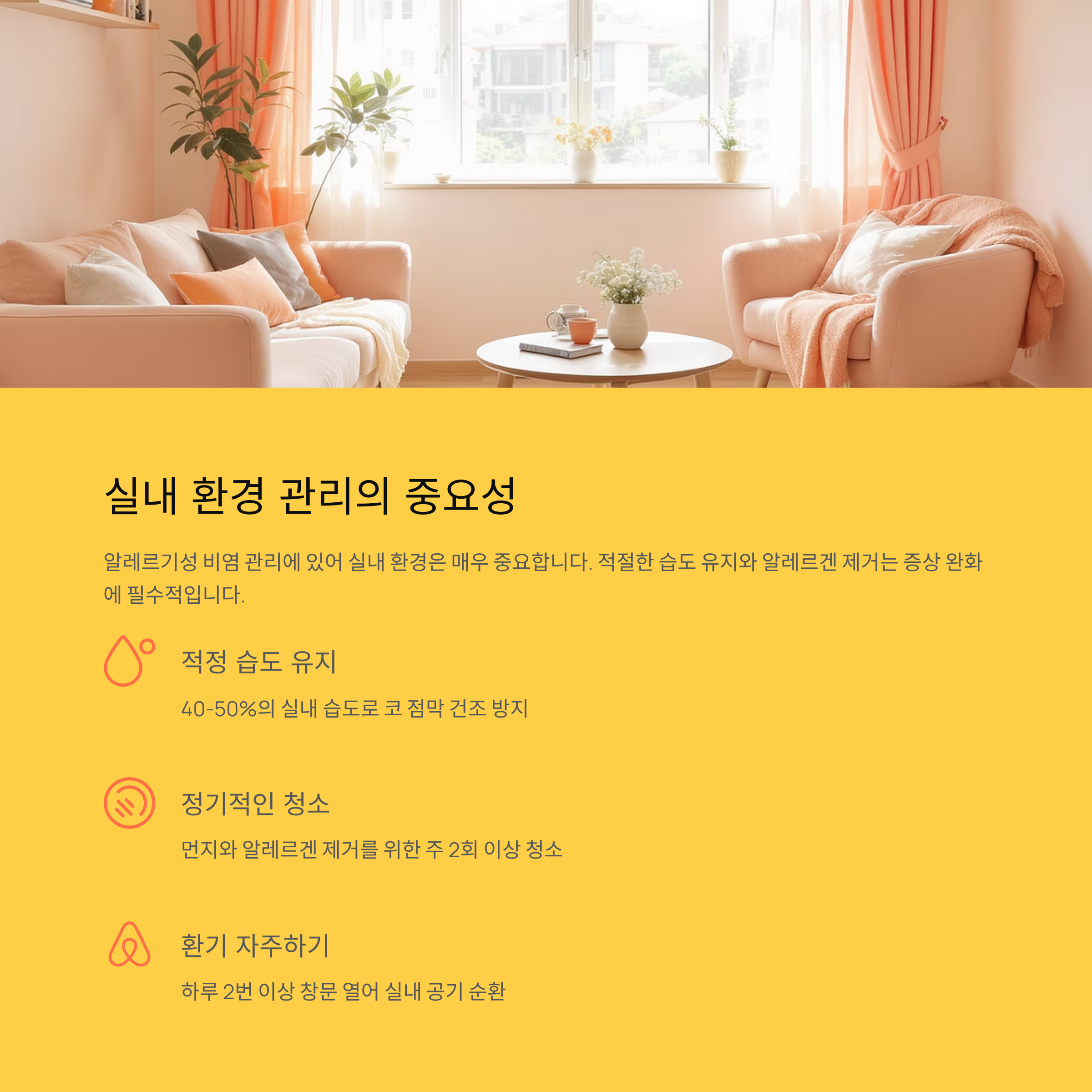 네 번째는 실내 환경과 습도 관리입니다. 저는 매년 겨울마다 난방으로 인해 실내가 건조해지면 비염 증상이 심해졌는데, 가습기를 사용해 습도를 50~60%로 유지하고, 하루 2~3회 환기를 철저히 했습니다. 침구류도 1~2주마다 55도 이상 뜨거운 물로 세탁해 집먼지진드기를 제거했고, 카펫과 커튼은 최소화했습니다. 이렇게 관리하니 밤새 코막힘으로 깼던 날이 줄어들고, 아침에도 코가 편안해졌습니다. 특히 수면 중 입호흡 방지를 위해 베개 높이를 조금 높여주는 것도 도움이 되었습니다.