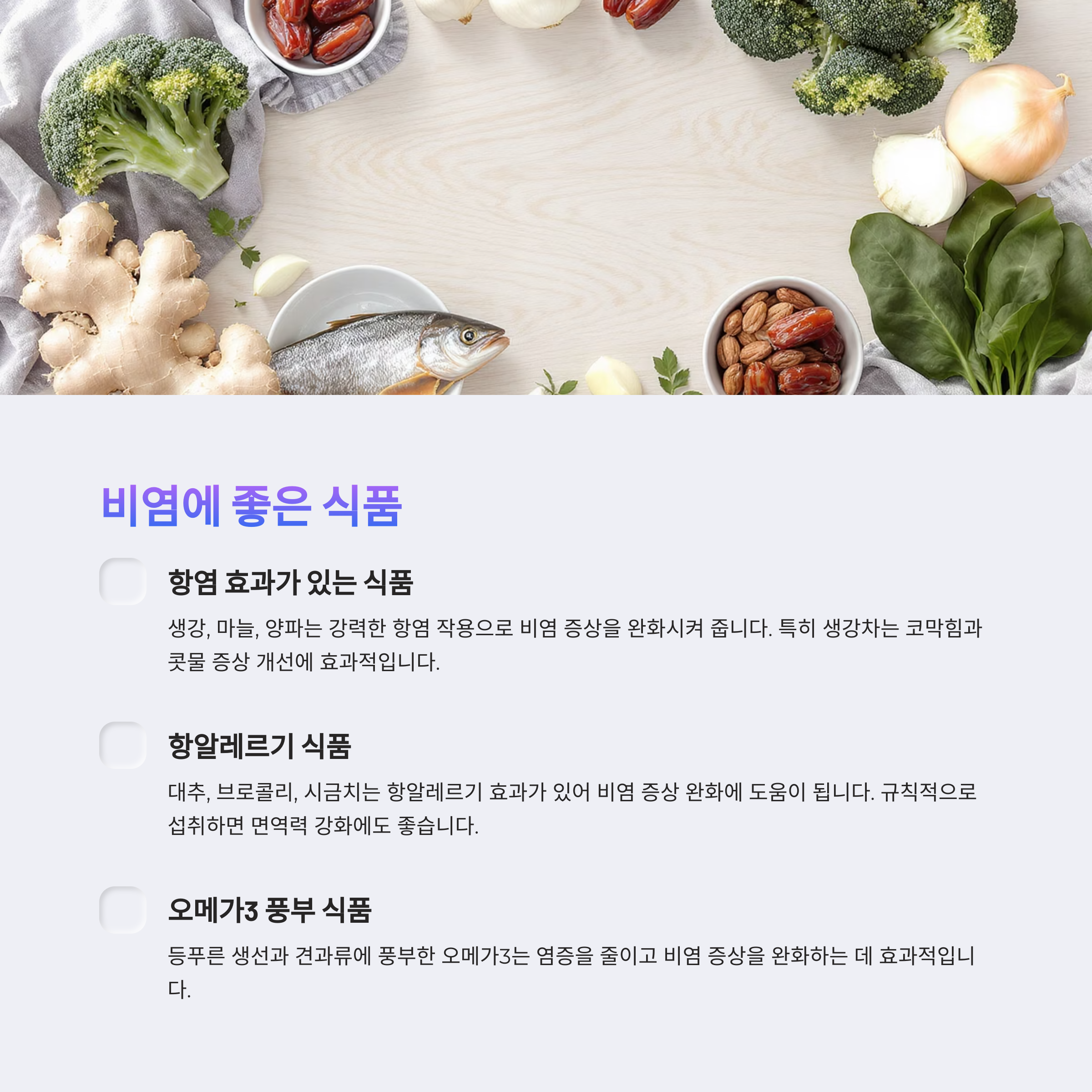 첫째, 생강은 대표적인 항염 식품으로 몸을 따뜻하게 하고 점막 혈류를 개선해 코막힘 완화에 도움이 됩니다. 생강차, 생강꿀물, 생강조림 등으로 꾸준히 섭취해 보세요. 둘째, 마늘은 알리신 성분이 강력한 항균·항바이러스 작용을 해 면역력을 높여줍니다. 된장찌개, 볶음요리, 샐러드드레싱 등에 마늘을 곁들여 섭취하면 좋습니다. 셋째, 양파에는 퀘르세틴이 풍부해 히스타민 분비를 억제해 비염 증상을 완화합니다. 생양파 샐러드, 양파즙, 양파장아찌 등으로 다양하게 섭취하세요. 넷째, 대추는 면역력 강화와 항알레르기 효과가 있어 대추차, 대추죽으로 섭취하면 좋습니다. 다섯째, 브로콜리, 시금치, 당근 같은 녹황색 채소는 비타민, 미네랄, 항산화 물질이 풍부해 점막 건강을 지켜줍니다. 여섯째, 고등어, 연어 같은 등 푸른 생선은 오메가 3 지방산이 풍부해 염증 반응을 억제하고 면역 조절에 도움을 줍니다. 일주일에 2~3회 이상 섭취하면 좋습니다. 일곱째, 녹차에는 카테킨이 풍부해 항염, 항산화 효과가 있으나 카페인 민감성이 없는 경우 적당량만 섭취하세요. 여덟째, 호두, 아몬드 같은 견과류는 비타민E와 오메가 3을 함유해 점막 보호와 면역력 강화에 도움이 됩니다.