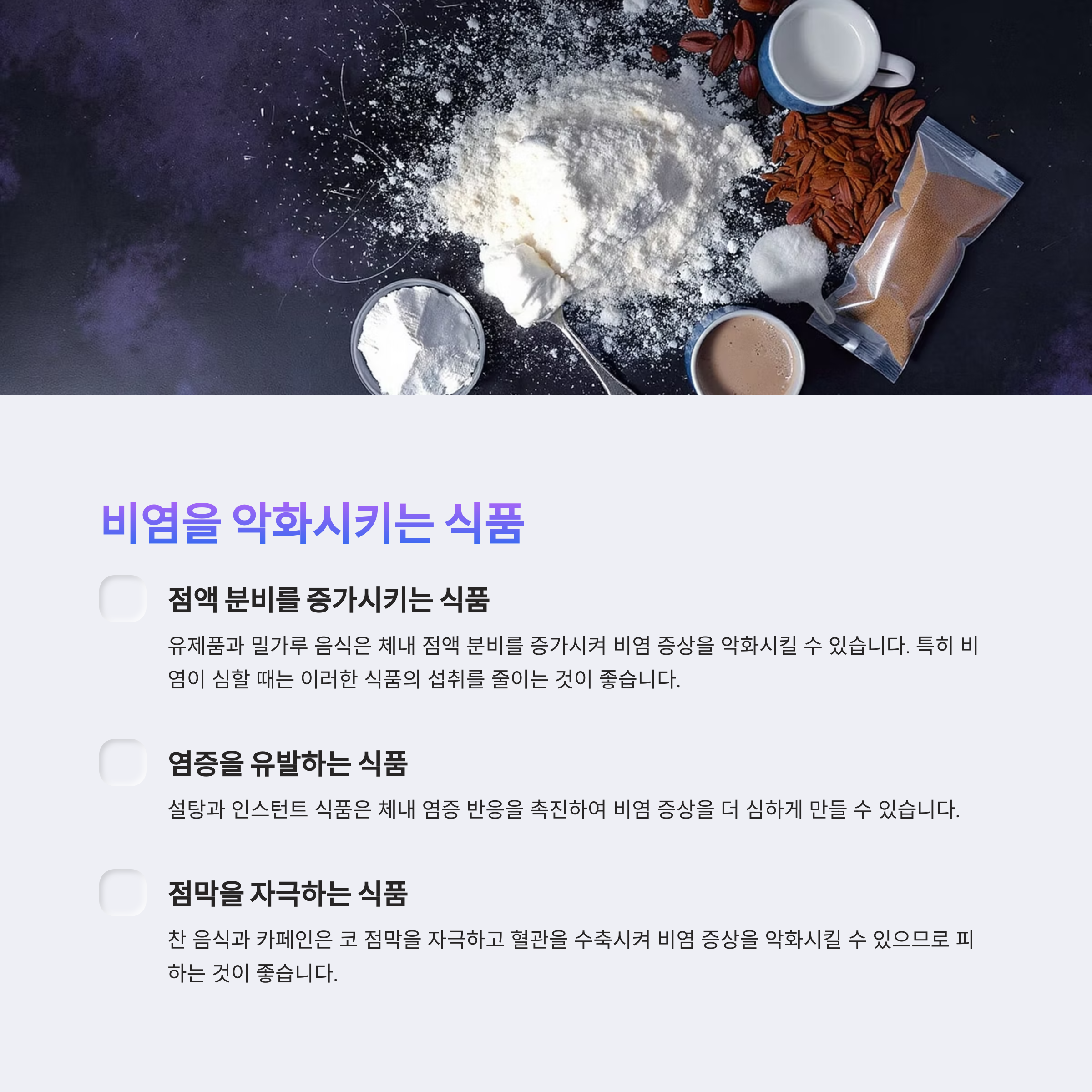 첫째, 유제품은 일부 사람들에게 점액 분비를 증가시켜 코막힘을 악화할 수 있으므로 본인 체질을 확인 후 섭취 여부를 결정하세요. 둘째, 밀가루 음식은 소화 시 체내 점액 생성을 늘려 코막힘을 심화시킬 수 있으니 빵, 면류 섭취를 줄이는 것이 좋습니다. 셋째, 과도한 설탕과 단 음식은 염증 반응을 촉진해 면역력을 떨어뜨립니다. 단 음료, 케이크, 과자 섭취를 줄이세요. 넷째, 아이스크림, 찬 음료, 냉면 등 차가운 음식은 점막을 수축시켜 비염 증상을 악화시킵니다. 다섯째, 카페인은 이뇨작용으로 체내 수분을 빠르게 배출해 점막을 건조하게 하므로 커피, 에너지음료, 진한 녹차 섭취를 줄이는 것이 좋습니다. 여섯째, 인스턴트 음식과 가공식품은 나트륨과 첨가물이 많아 점막 염증과 부종을 악화시키므로 피하세요.