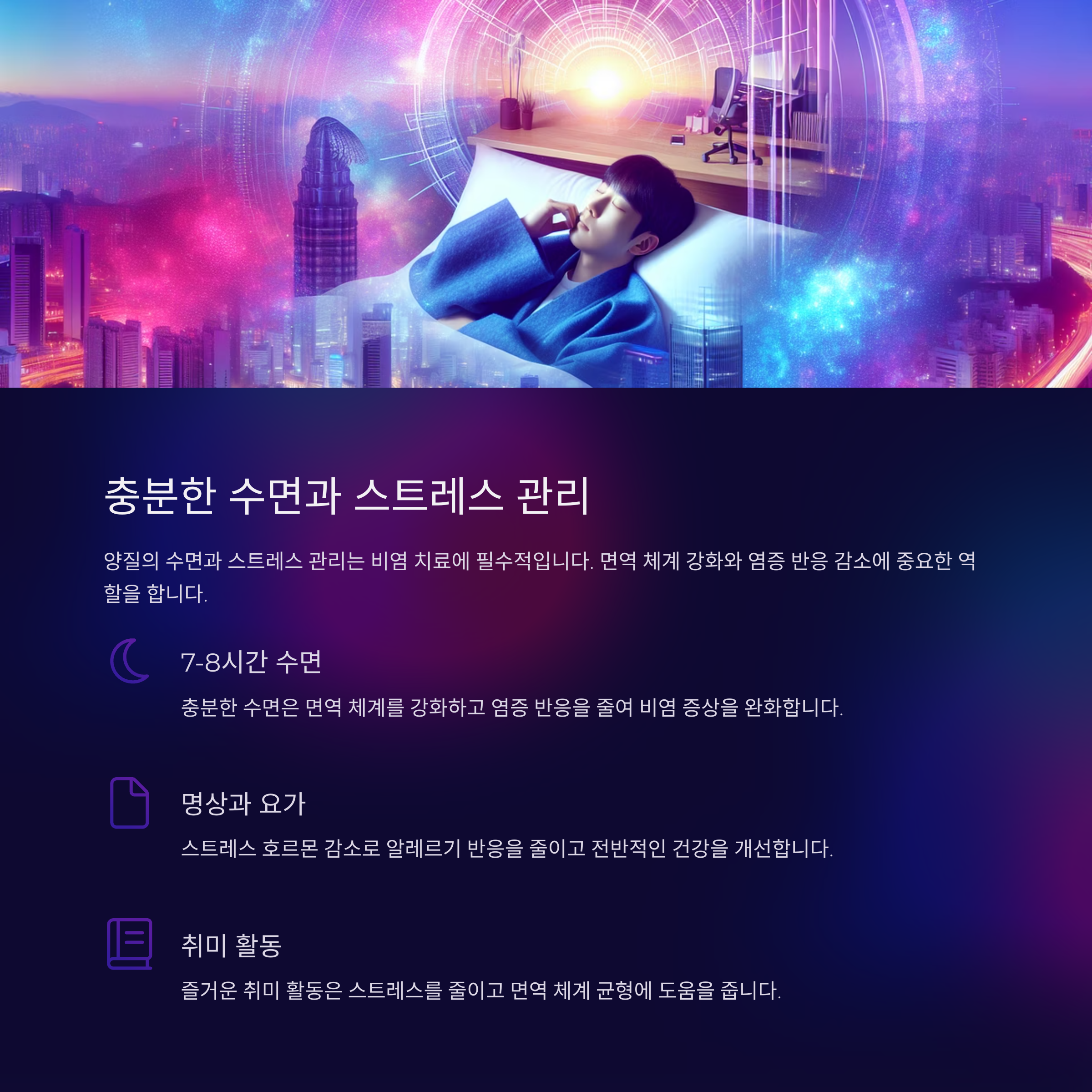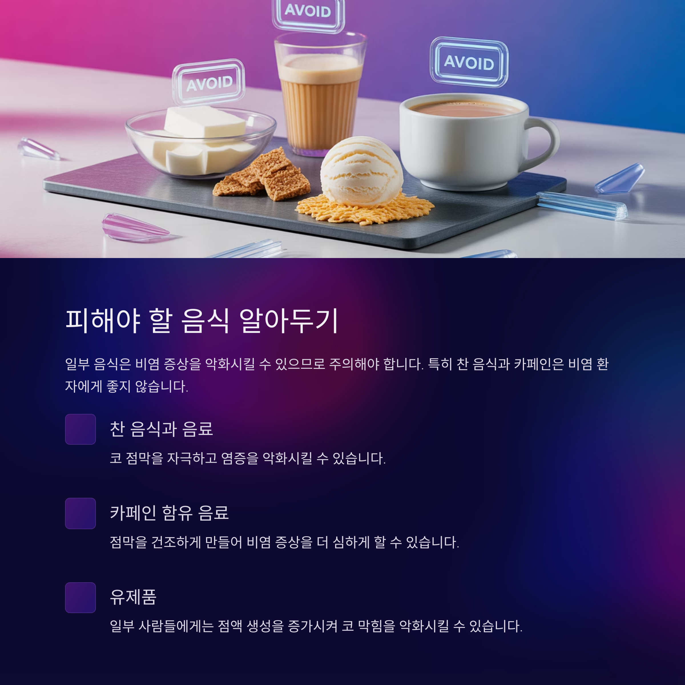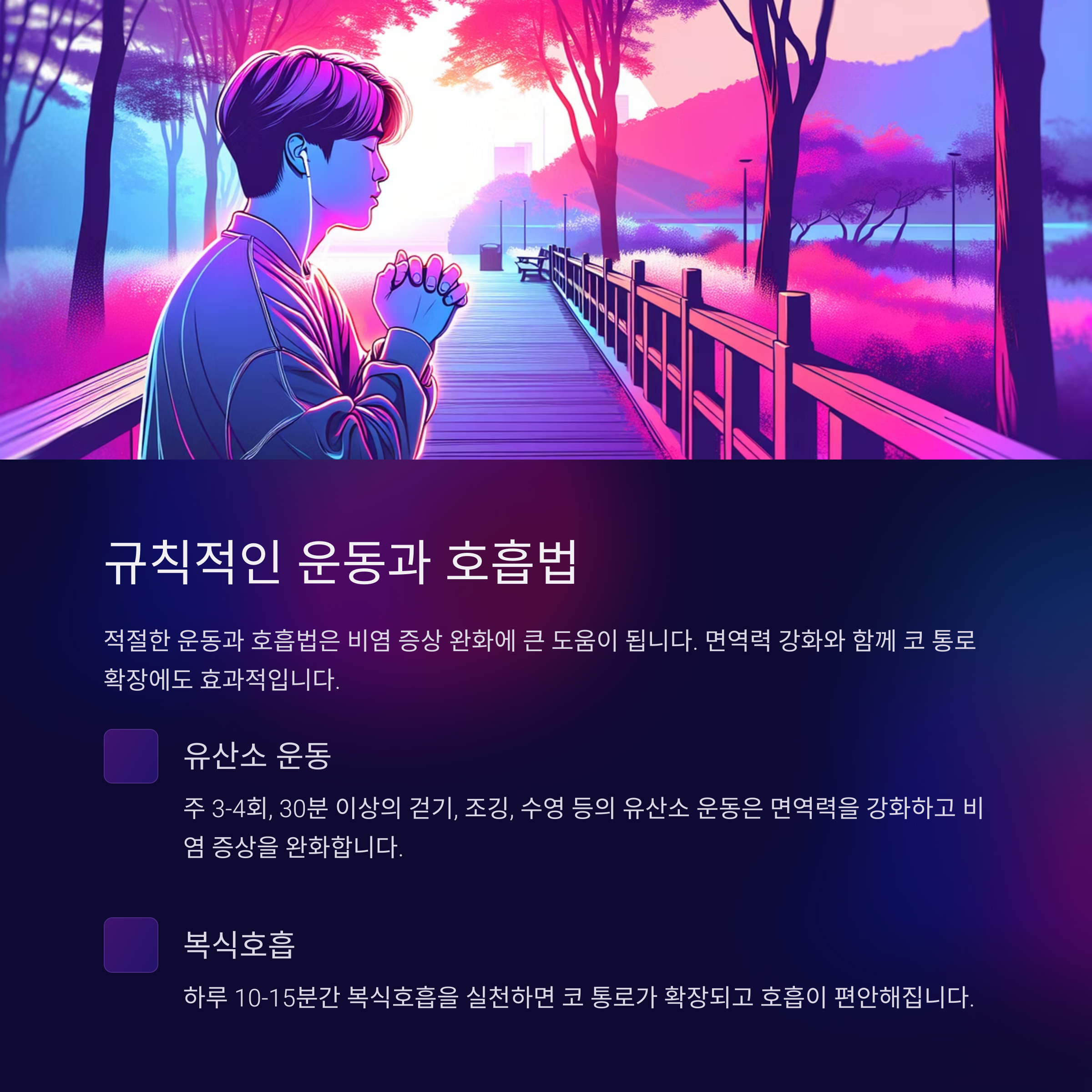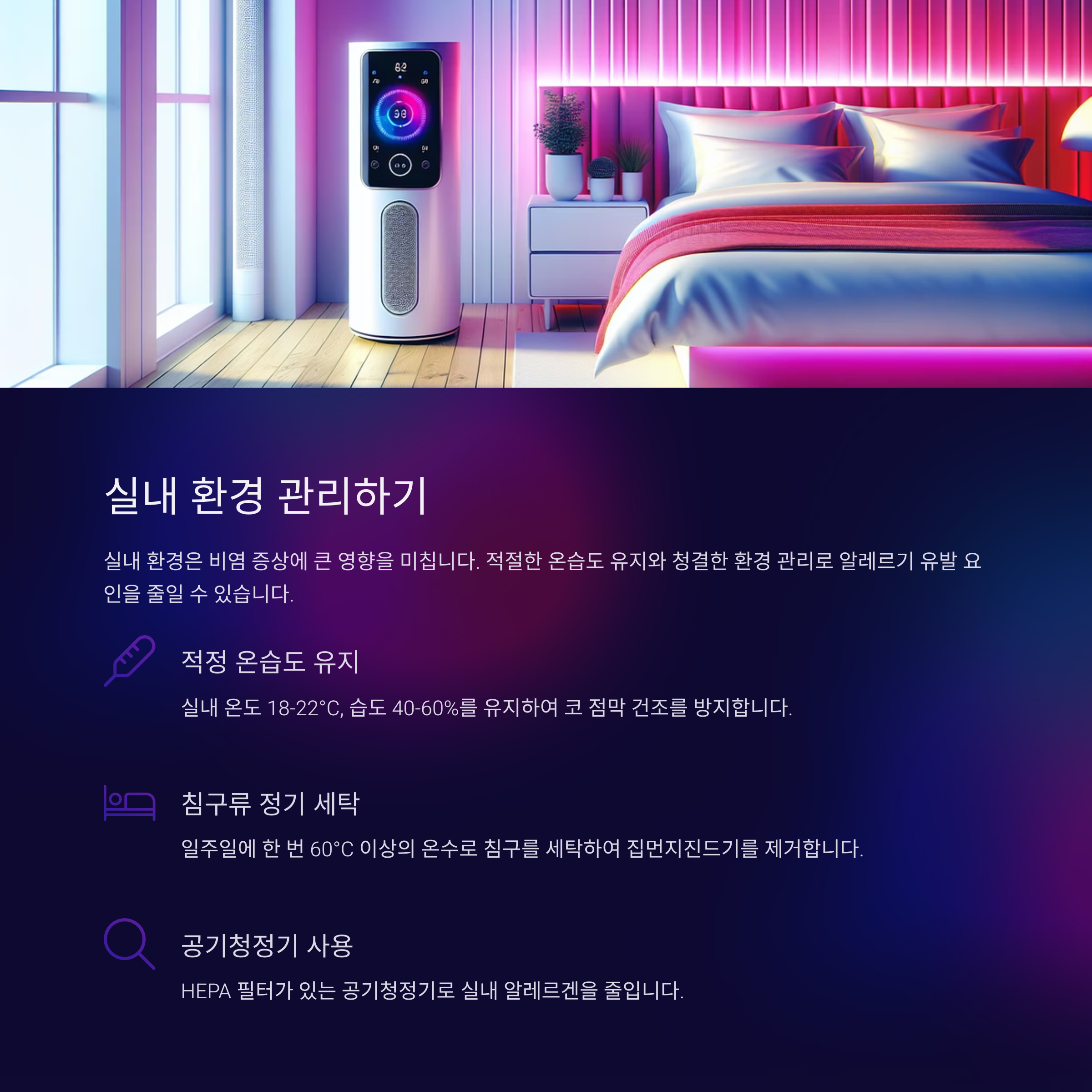 첫째, 체질에 따라 따뜻한 음식을 섭취해 몸을 데우는 것이 중요합니다. 생강차, 대추차, 계피차는 폐를 덥히고 기혈 순환을 촉진해 비염 증상 완화에 도움이 됩니다. 둘째, 찬 음식, 아이스크림, 냉면, 찬 음료는 점막을 수축시켜 증상을 악화시키므로 피하세요. 셋째, 과로와 스트레스는 면역을 약화시키므로 충분한 수면과 휴식을 취하고, 명상, 반신욕, 따뜻한 아로마 족욕 등으로 몸의 기순환을 원활히 해주세요. 넷째, 규칙적인 복식호흡과 기공, 요가 운동은 기혈 순환을 개선하고 호흡근을 강화해 비염 완화에 좋습니다. 다섯째, 실내 온습도는 20~22도, 습도 50~60%를 유지해 점막 건조를 방지하세요. 여섯째, 코 주변을 따뜻한 수건으로 찜질하거나, 한방 아로마 오일(유칼립투스, 티트리)을 이용해 코 주변과 흉곽을 마사지하면 점막 기능 회복에 도움이 됩니다. 일곱째, 침구류, 커튼은 주 1회 이상 55도 이상의 뜨거운 물로 세탁해 집먼지진드기를 제거하고 햇볕에 말려 살균하세요.
