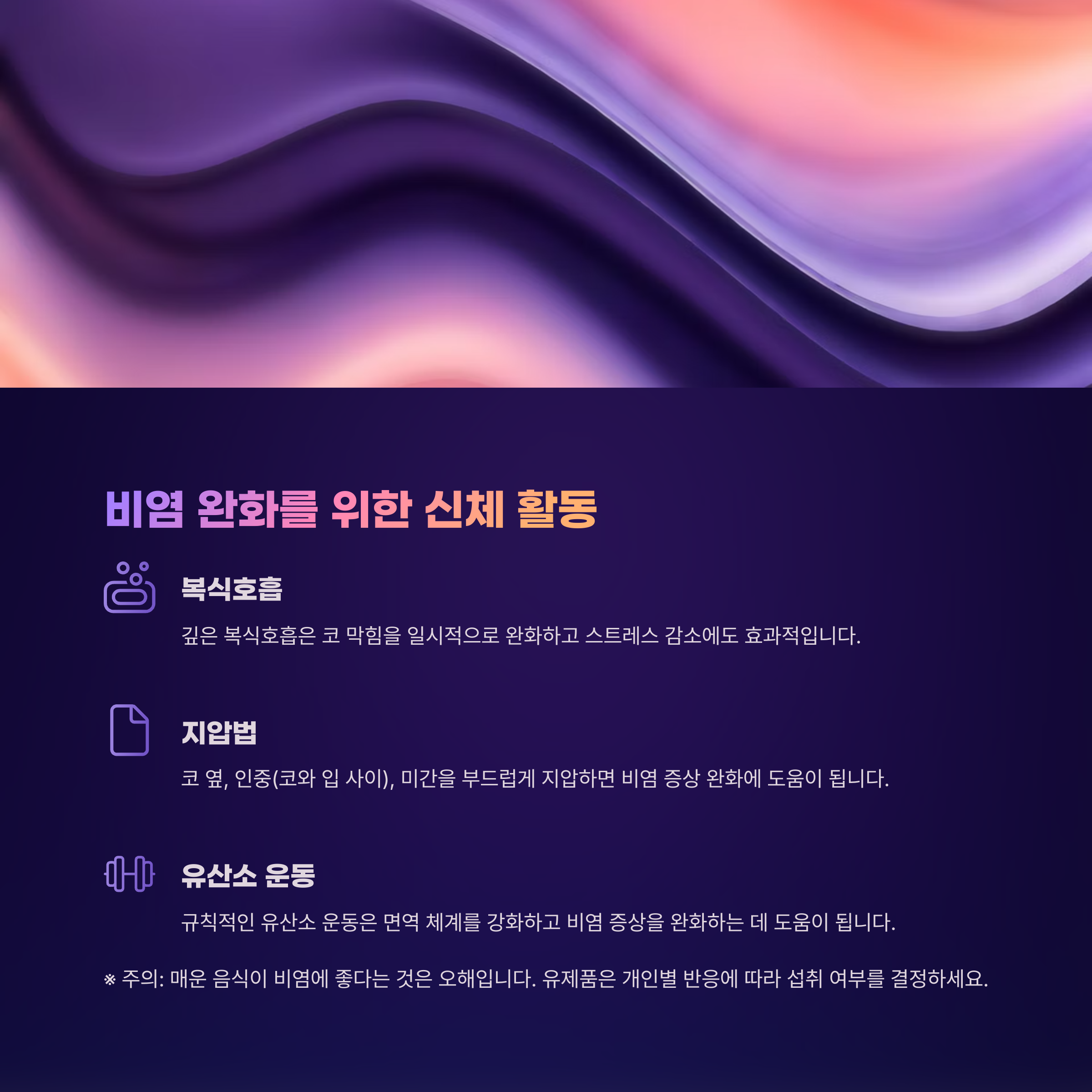 비염 자연치료는 약물 치료를 대체하는 것이 아니라 보완하는 방법입니다. 실내 환경을 청결하고 적절한 온습도로 유지하며, 생강차나 대추차 같은 따뜻한 음료를 통해 몸을 따뜻하게 하고, 식염수 코 세척으로 알레르기 물질을 제거해 점막 건강을 지키는 생활습관을 꾸준히 실천해야 합니다. 또한 복식호흡과 지압 마사지, 규칙적인 운동을 병행해 면역력을 높이는 것이 중요합니다. 그러나 증상이 심해지거나 호흡 곤란, 축농증, 중이염 등의 합병증이 의심될 경우 즉시 전문의 진료를 받아야 합니다. 자연치료는 단기간 완치를 기대하기보다는 장기적이고 꾸준히 실천할 때 효과가 있다는 점을 명심하세요.