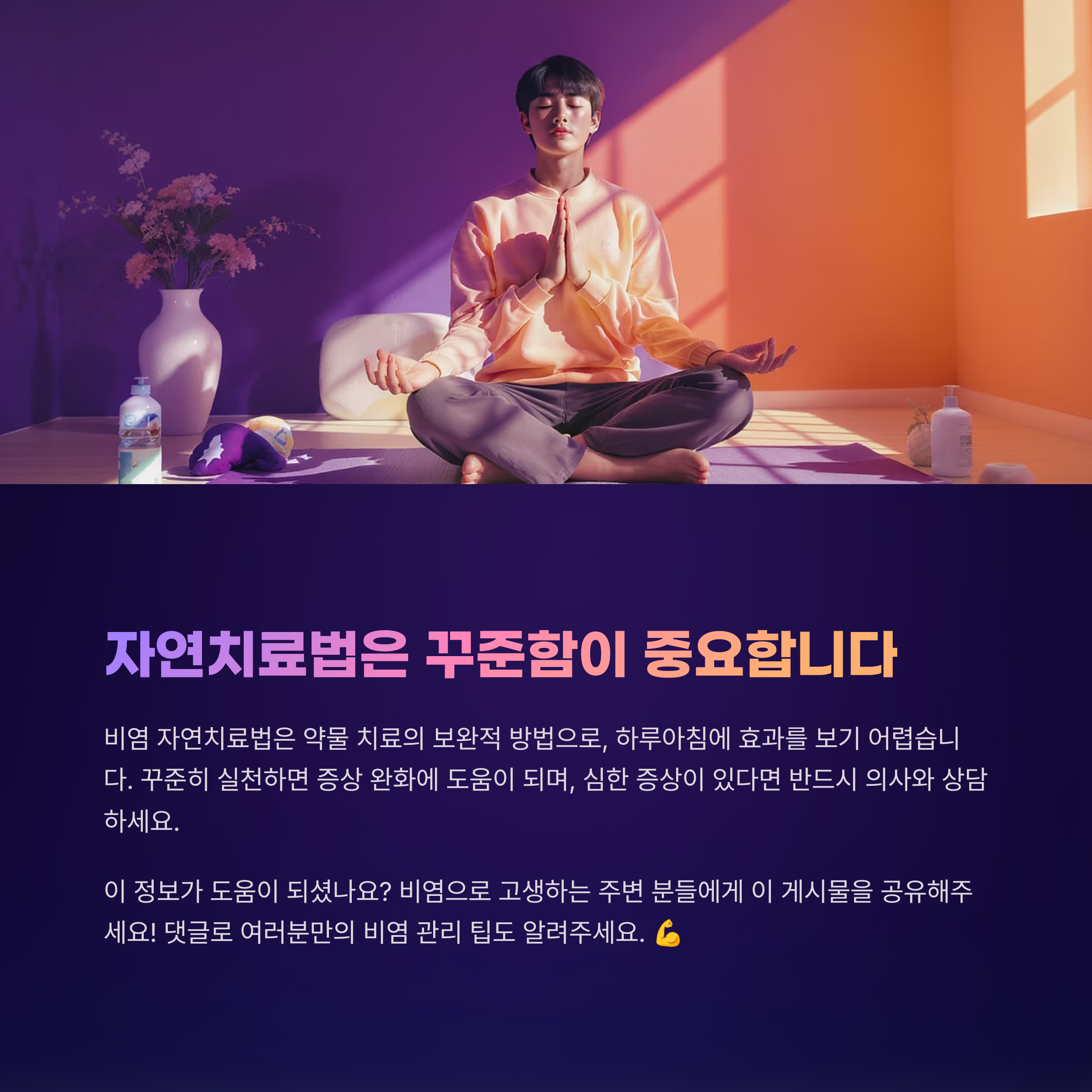 오늘은 비염 자연치료의 효과 있는 방법과 잘못된 오해를 살펴보았습니다. 올바른 정보를 바탕으로 생활 속에서 실천해 약물 의존도를 줄이고 건강하게 비염을 관리해 보시기 바랍니다. 도움이 되셨다면 블로그 구독과 공유로 더 많은 분들이 건강을 되찾을 수 있도록 함께해 주세요.