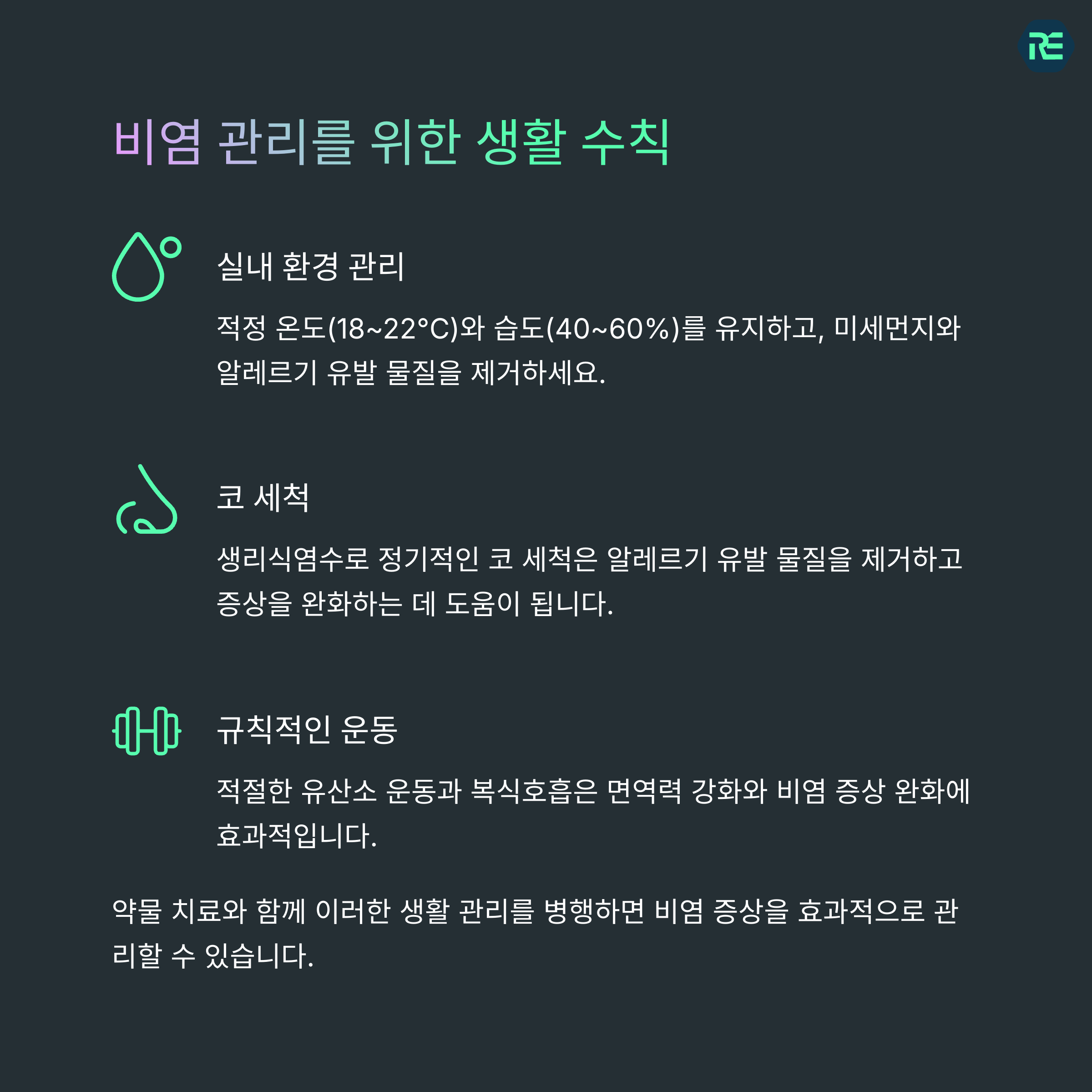 비염 치료는 약물과 생활관리의 병행이 필수입니다. 항히스타민제, 스테로이드 분무제, 면역치료 등을 전문의 처방에 따라 복용해야 하며, 증상이 가볍다고 약물 복용을 중단하면 증상이 만성화될 수 있습니다. 또한 코세척은 과도하게 하면 점막 보호층이 손상될 수 있으므로 하루 1~2회를 넘지 않는 것이 좋습니다. 최근에는 알레르기 원인 물질을 소량 투여해 체질을 개선하는 면역 치료도 시행되고 있으니, 반복되는 비염으로 고생한다면 전문의 상담을 통해 장기적인 치료 계획을 세워보는 것이 도움이 됩니다.