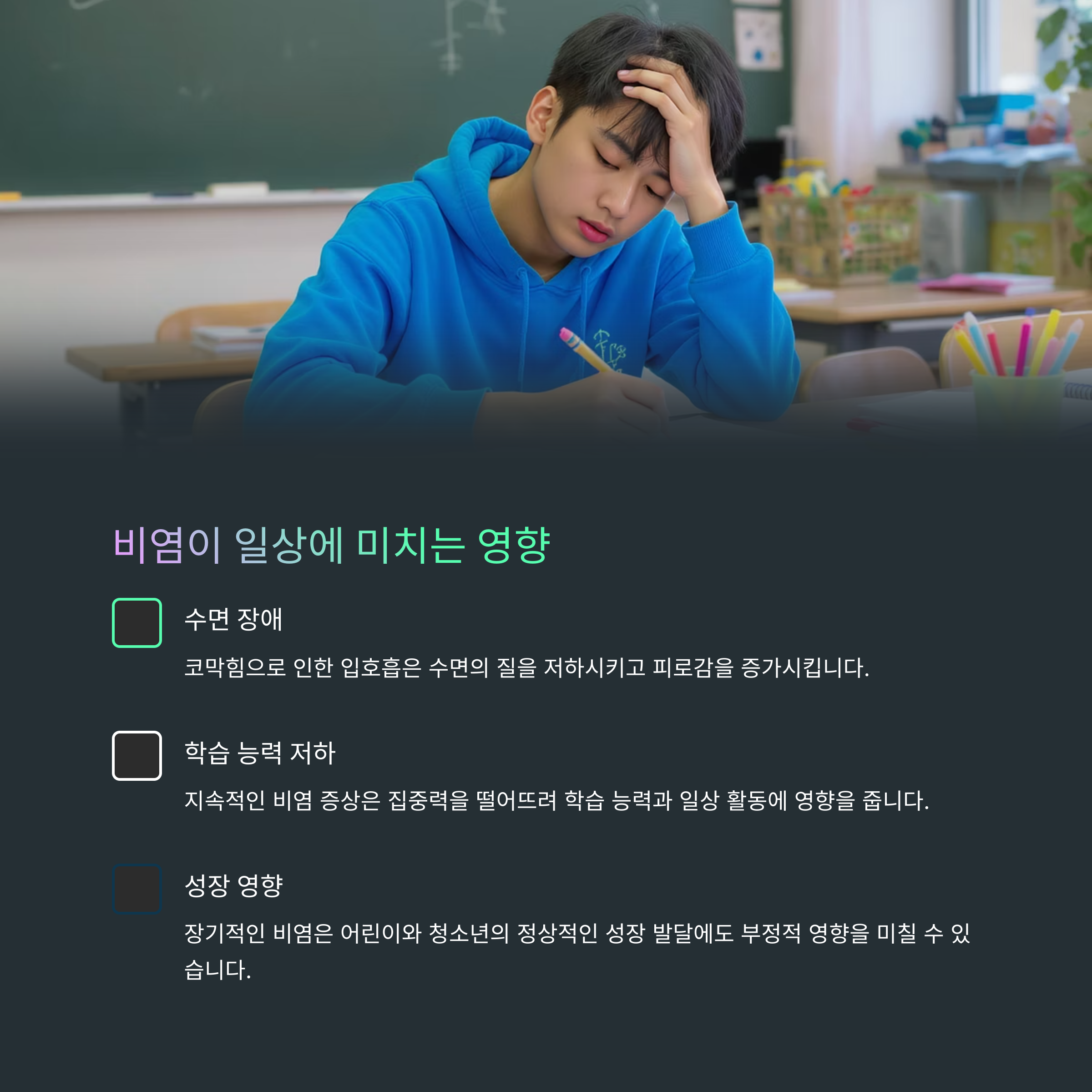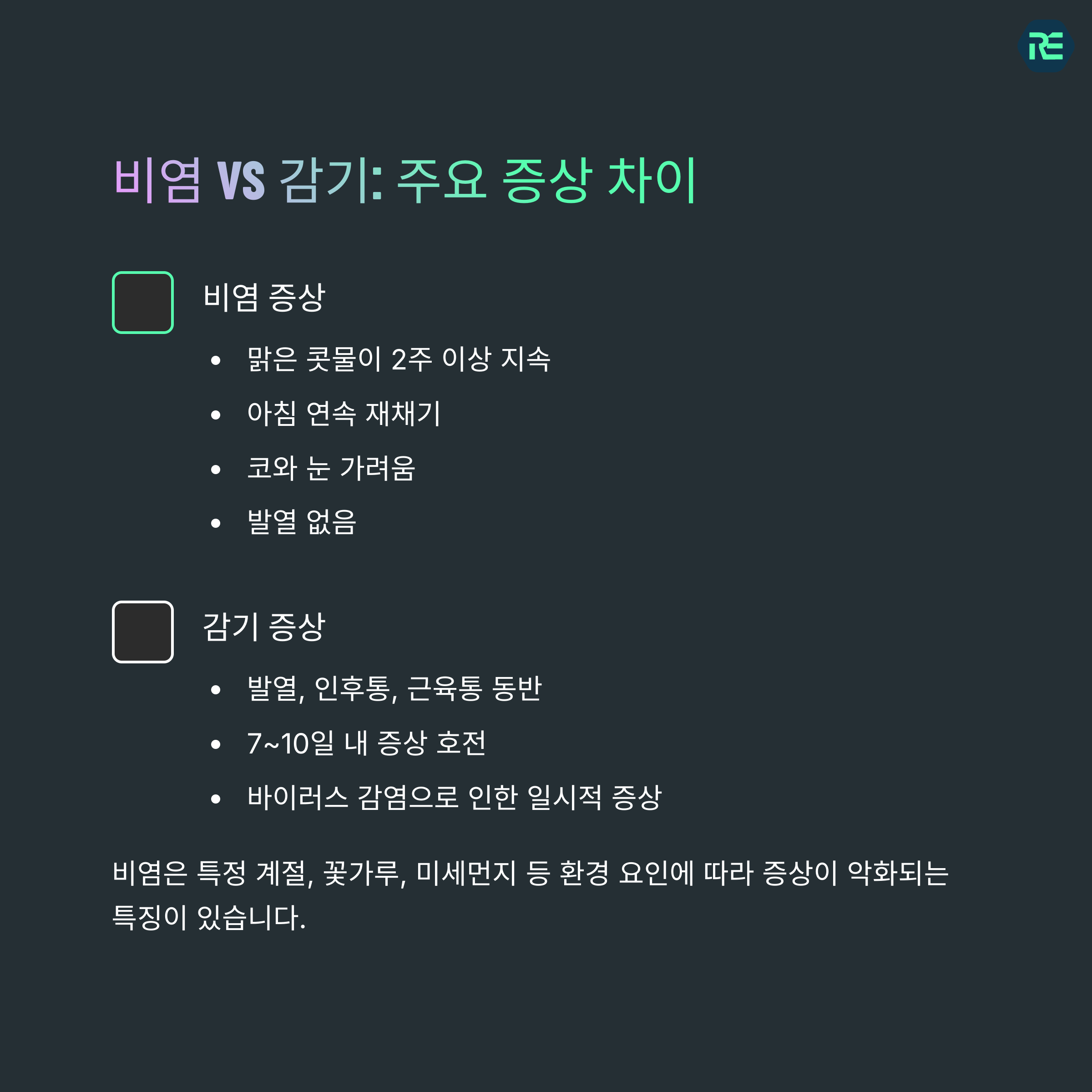 비염은 많은 사람들이 감기와 혼동하는 질환입니다. 재채기, 콧물, 코막힘 등 감기와 비슷한 증상이 나타나지만, 원인과 관리 방법이 다르기 때문에 정확히 구분하는 것이 매우 중요합니다. 비염을 감기로만 생각하고 방치하면 만성화되거나 부비동염, 중이염 등 합병증으로 이어질 수 있습니다. 이번 글에서는 비염 증상과 감기의 차이점, 비염을 의심해야 하는 상황, 생활 속 관리와 예방법까지 자세히 알려드리겠습니다. 티스토리 애드센스 승인용 블로그 글로 활용하시기 바랍니다.