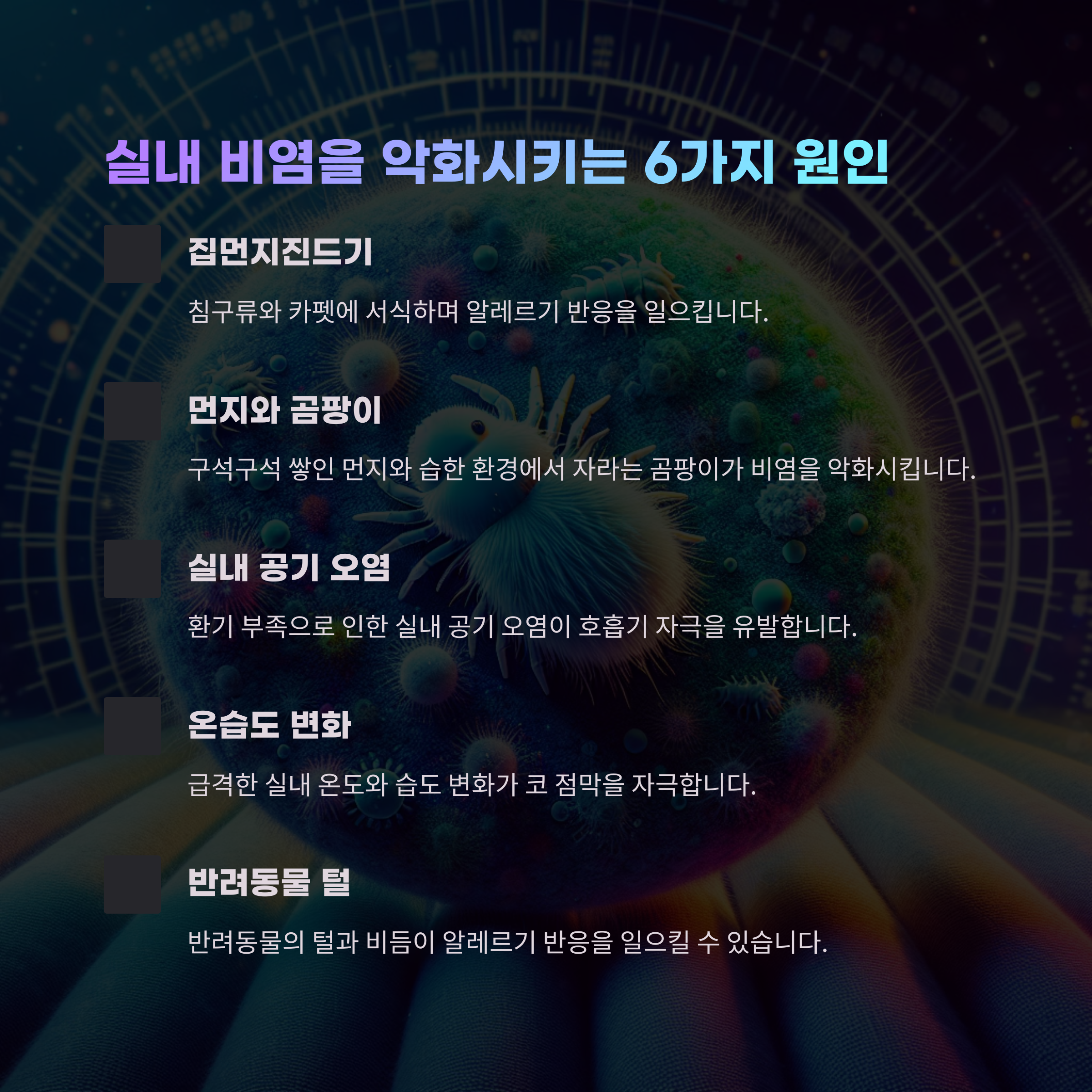 실내에서 비염 증상이 심해지는 이유는 먼지, 진드기, 곰팡이, 공기 오염, 온도와 습도 변화, 반려동물 털 등 다양한 요인이 복합적으로 작용하기 때문입니다. 청소, 환기, 적정 온습도 유지, 수분 섭취, 차 음용 등 생활습관 관리가 비염 완화의 핵심입니다.