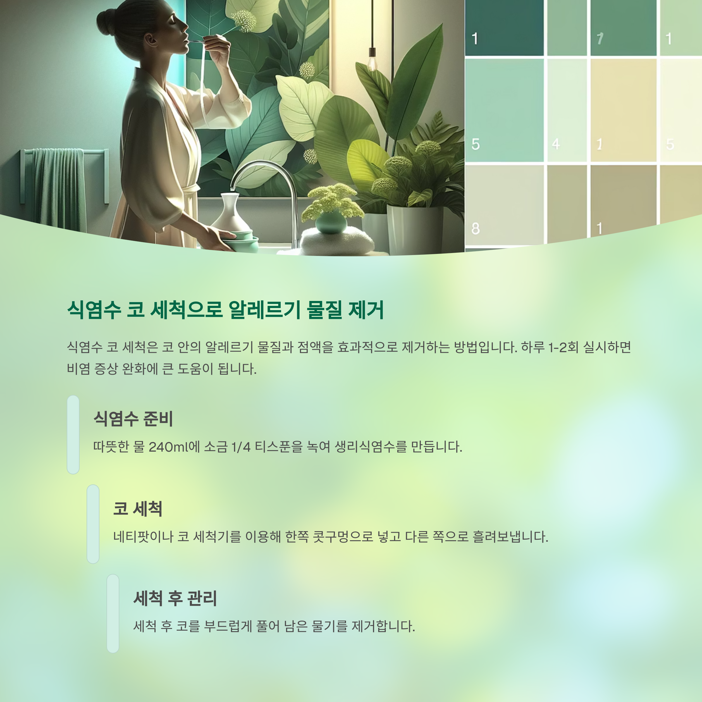 비염 자연치료에서 빼놓을 수 없는 것이 코 세척입니다. 식염수 코 세척은 알레르기 유발 물질과 먼지를 제거해 점막 염증을 완화하고, 코막힘을 해소해줍니다. 생리식염수를 네티팟이나 전용 코세척기에 넣고 한쪽 콧구멍으로 넣어 반대쪽으로 배출시키는 방법이 일반적이며, 하루 1~2회만 꾸준히 해도 효과를 볼 수 있습니다. 외출 후, 청소 후, 자기 전 세척하면 더욱 좋습니다. 단, 직접 식염수를 만들 경우 반드시 끓인 물을 식혀 사용해야 하며, 사용 후에는 네티팟을 깨끗이 세척, 건조해 위생을 유지해야 합니다. 코 세척은 약물 없이도 비염 관리가 가능한 가장 안전하고 효과적인 방법 중 하나입니다.