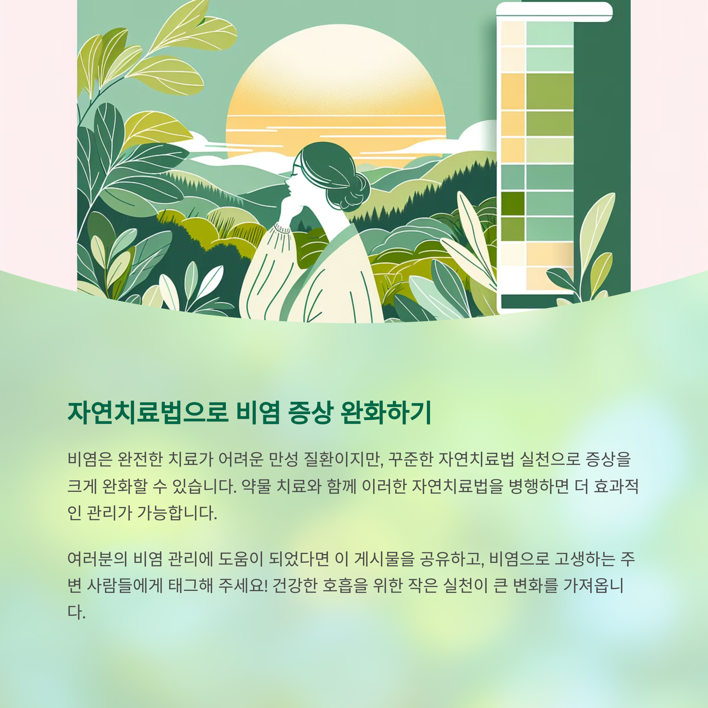 지금까지 약 없이도 가능한 비염 자연치료법 TOP 7을 알아보았습니다. 생활 속 작은 습관 개선과 자연요법만으로도 약물 사용을 줄이고 증상을 완화할 수 있으니, 오늘부터 하나씩 실천해보세요. 도움이 되셨다면 블로그를 구독하고 주변에도 공유해 더 많은 분들이 건강을 회복할 수 있도록 함께해 주세요.