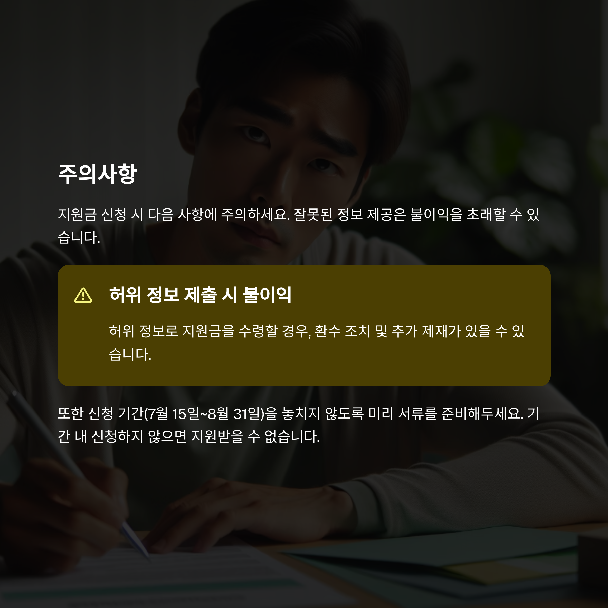 허위 또는 중복 신청이 확인되면 지원금 환수는 물론, 향후 복지정책 대상에서 제외될 수 있습니다.
